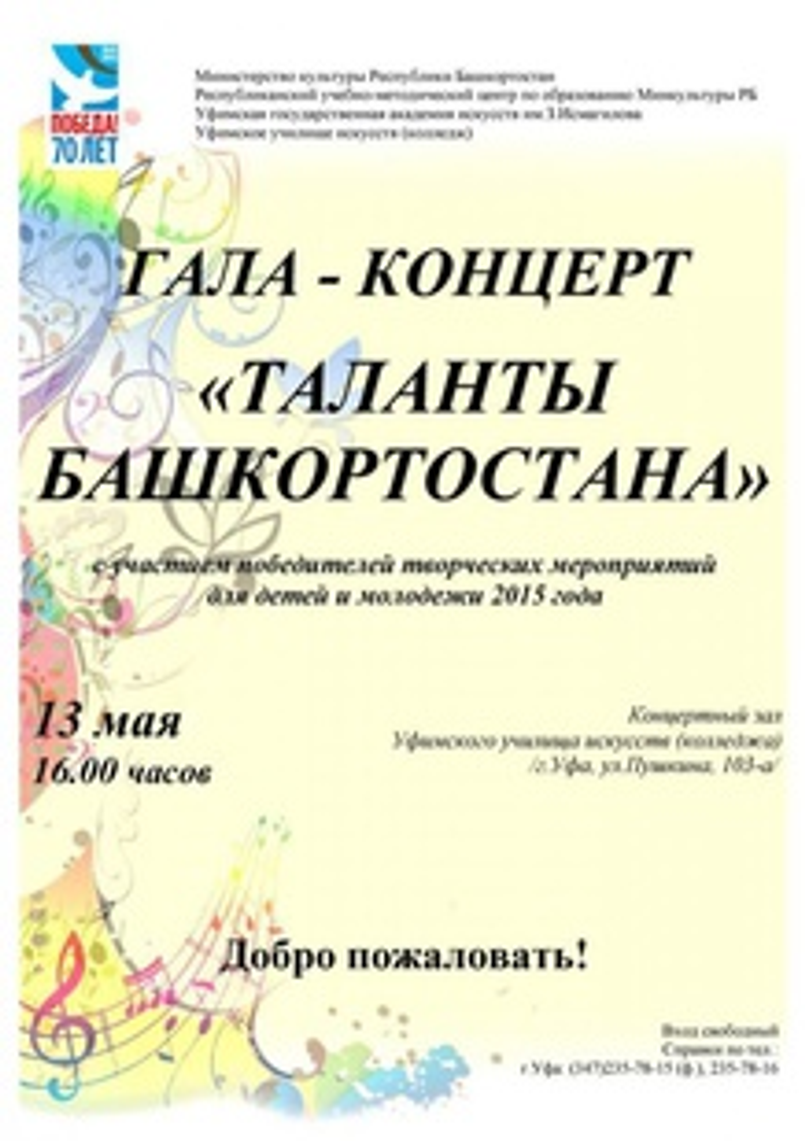ӨФӨ, 2015 йыл, 12 май. /«Башинформ» мәғлүмәт агентлығы, Ләйлә Аралбаева/. Шаршамбы, 13 майҙа, Өфө сәнғәт училищеһының концерт залында быйылғы балалар һәм йәштәр өсөн ижади сараларҙа еңеүселәр ҡатнашлығында «Башҡортостан таланттары»ның гала-концерты була.