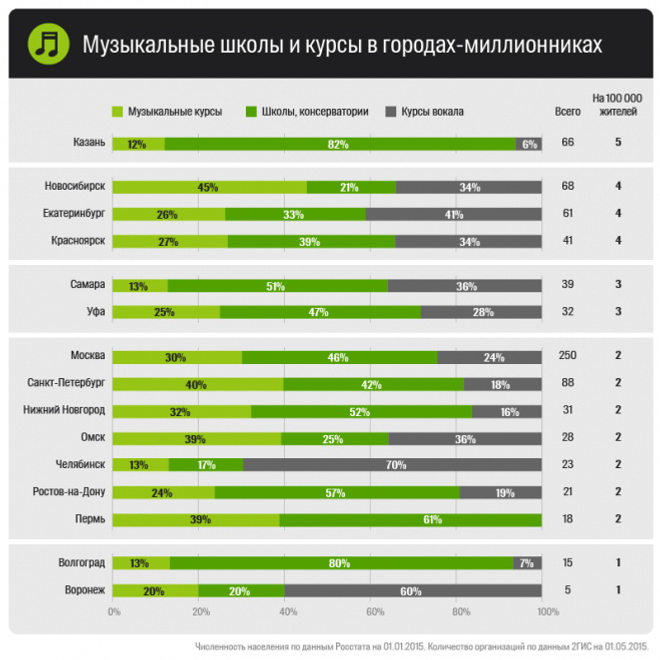 Рейтингта тәүге урынды Ҡазан биләй. Татарстандың баш ҡалаһында 66 музыкаль белем биреү учреждениеһы бар. Икенсе урында — Новосибирск, Екатеринбург һәм Красноярск. Был ҡалаларҙа 100 мең кешегә дүрт музыкаль уҡыу йорто тура килә.