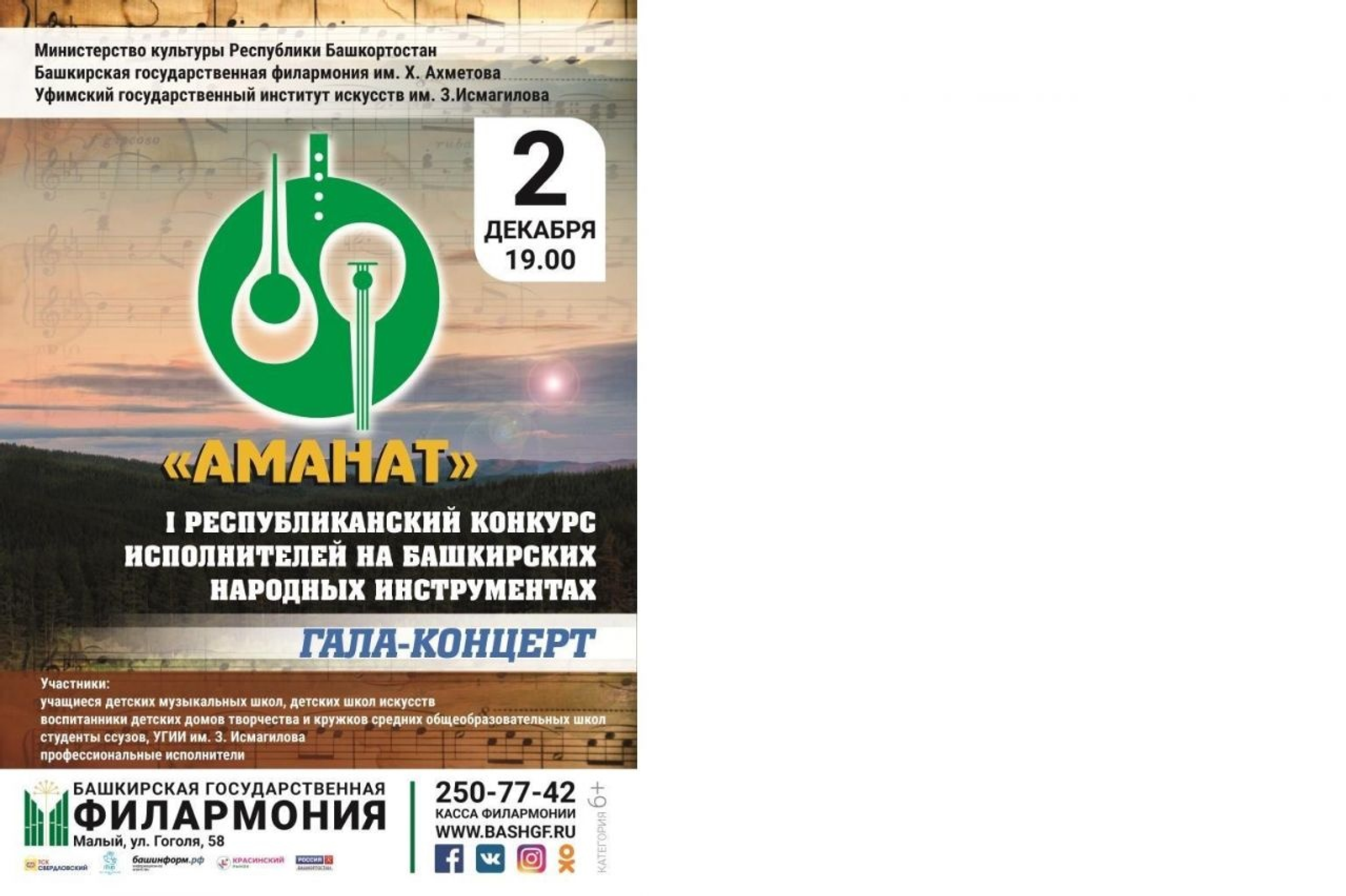 ӨФӨ, 2016 йыл, 16 ноябрь. /«Башинформ» мәғлүмәт агентлығы, Ләйлә Аралбаева/. Башҡортостанда тәүге тапҡыр «Аманат» башҡорт халыҡ музыка ҡоралдарында уйнаусыларҙың республика конкурсы үткәрелә. Бәйге думбырасылар һәм ҡыл-ҡумыҙсылар, шулай уҡ ошо инструменттар ингән ансамблдәр өсөн ойошторола. Тыңлауҙар 2 декабрҙә Башҡорт дәүләт филармонияһының Кесе залында уҙа. Шунда уҡ кисен лауреаттарҙың гала-концерты була.