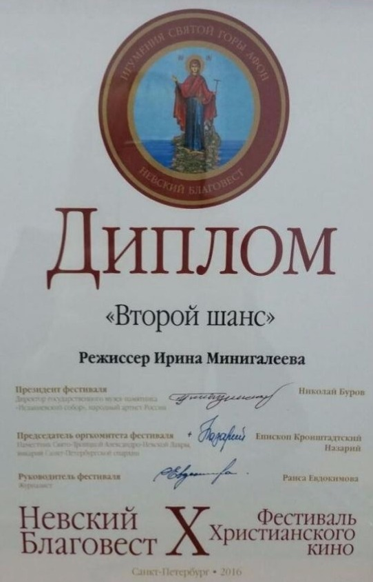 ӨФӨ, 2016 йыл, 2 декабрь. /«Башинформ» мәғлүмәт агентлығы, Ләйлә Аралбаева/. Башҡортостан юлдаш телеканалы журналисы Ирина Миңлеғәлиеваның фильмы «Невский Благовест» Х халыҡ-ара христиан киноһы фестиваленең дипломын яуланы. «Икенсе мөмкинлек» исемле фильм — Өфөлә йәшәгән Дмитрий Молев тураһында. Дауыллы 90-сы йылдарҙа уңышлы эшҡыуар булған, күңелле тормош алып барған. Әммә бер көндө ул автоһәләкәткә осрай. Эргәһендә ултырған дуҫы һәләк була. Геройҙың күҙ алдынан бөтә тормошо үтә һәм ул дөрөҫ йәшәмәгәнлеген аңлай. Ошо мәлдә ул: «Һиңә икенсе мөмкинлек бирәм», — тигән тауыш ишетә. Әлеге ваҡытта Дмитрий Молев — күп балалы атай. Яңыраҡ уның һигеҙенсе балаһы тыуған. Ул — «Уфимский иконостас» артеле директоры, бында эшләнгән әйберҙәр сиркәүҙәрҙе һәм ҡорамдарҙы биҙәй. Гуманитар ярҙам менән бер нисә тапҡыр Донбасҡа барған.