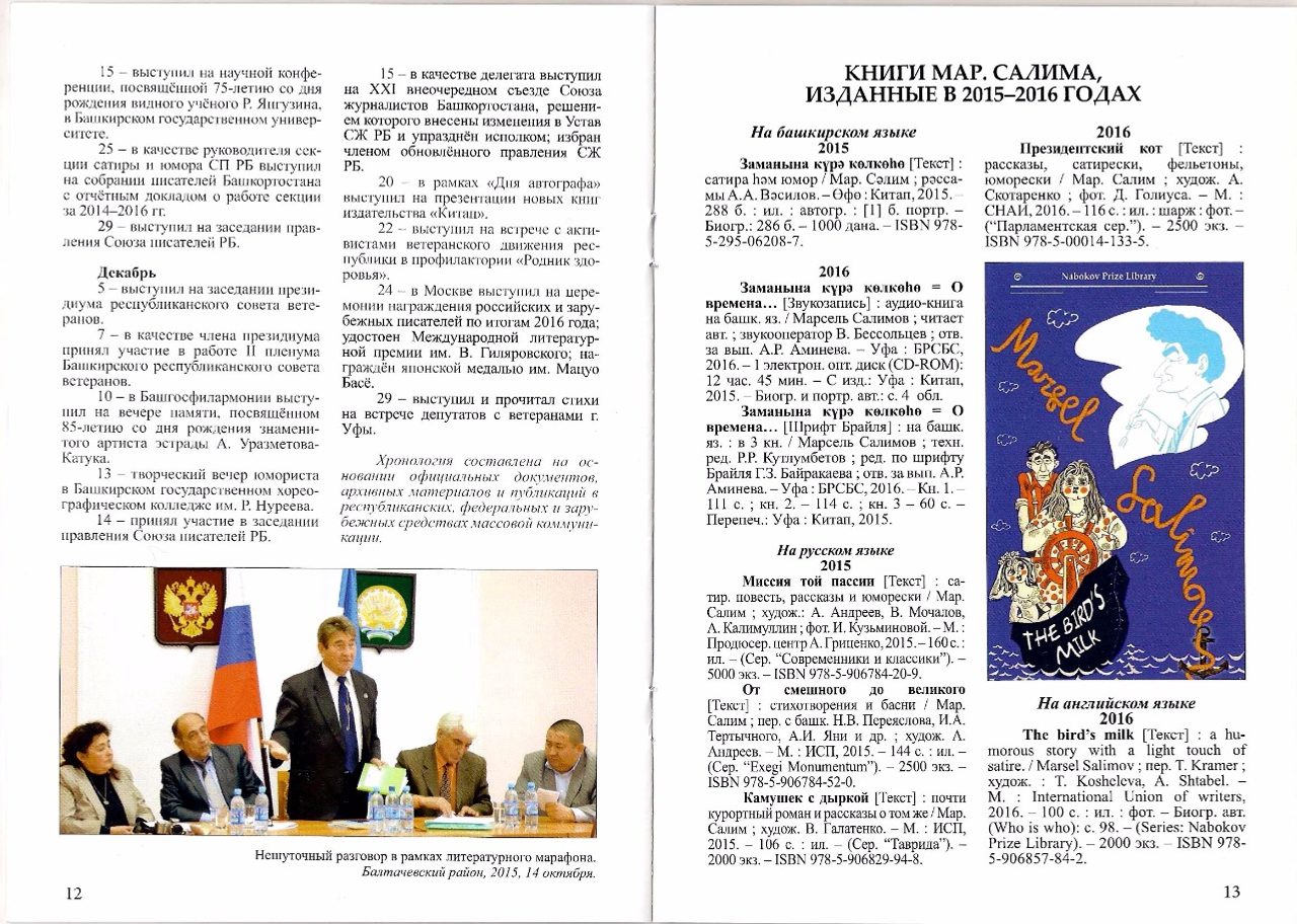 ӨФӨ, 2017 йыл, 30 ғинуар. /«Башинформ» мәғлүмәт агентлығы, Ләйлә Аралбаева/. Өфөлә «Рәсәйҙең алтын ҡаурыйы: Марсель Сәлимов» тигән биобиблиографик баҫма
