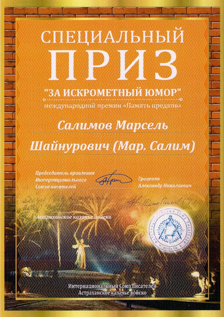 Әҙәби сараларҙа үҙенең сығыш һөҙөмтәләре буйынса билдәле башҡорт юморисы халыҡ-ара фестивалдең лауреаты булды. «Ата-бабалар иҫтәлеге» шиғри конкурсында ҡатнашып, Марсель Сәлимов «Үткер юмор өсөн» тигән махсус бүләк менән баһаланды.