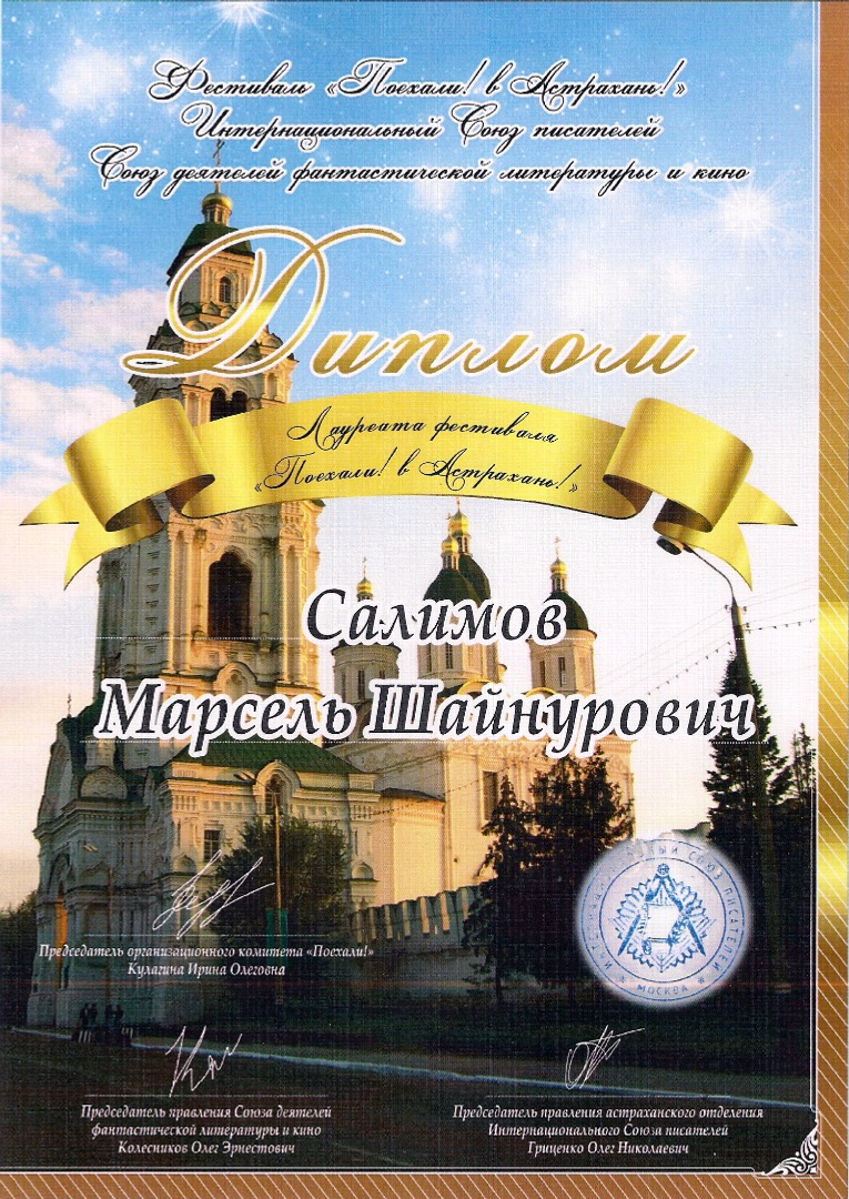 ӨФӨ, 2017 йыл, 21 сентябрь. /«Башинформ» мәғлүмәт агентлығы, Алик Шакиров/. Әстерханда «Киттек! Әстерханға!» халыҡ-ара әҙәбиәт фестивале уҙҙы, унда Рәсәйҙең һәм сит илдәрҙең күренекле яҙыусылары, шағирҙары һәм публицистар ҡатнашты. Республикабыҙҙан башҡорт сатиригы, бихисап халыҡ-ара һәм бөтә Рәсәй ижади фестивалдәре лауреаты Марсель Сәлимов (Мар. Сәлим) булды.