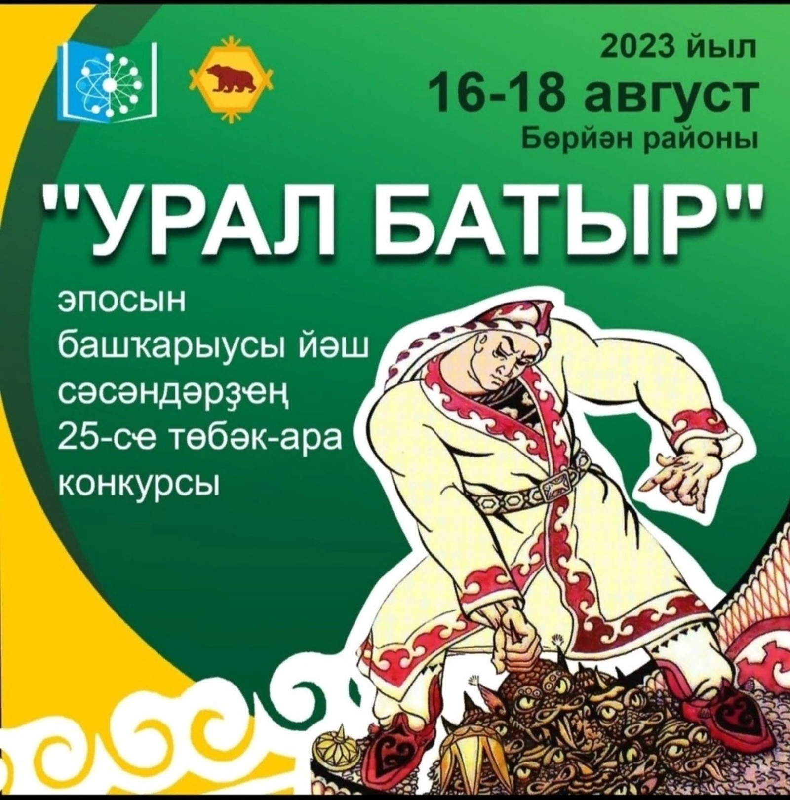 16–18 августа Бөрйән районында «Урал батыр» башҡорт халыҡ эпосын башҡарыусыларҙың һәм йәш сәсәндәрҙең 25-се юбилей конкурсының йомғаҡлау этабы үтәсәк.