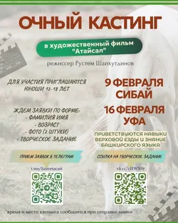 Башҡортостанда йәшәүселәрҙе «Атайсал» нәфис фильмына кастингҡа саҡыралар. Кастинг 9 февралдә – Сибайҙа, 16 февралдә Өфөлә ойошторола.