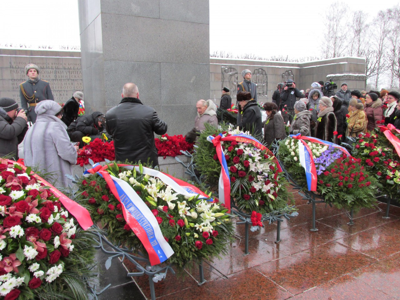 Санкт-Петербургта Пискарев ҡәберлегенең мемориаль стелаһына Башҡортостан исеменән сәскә гөлләмәһе һалынды