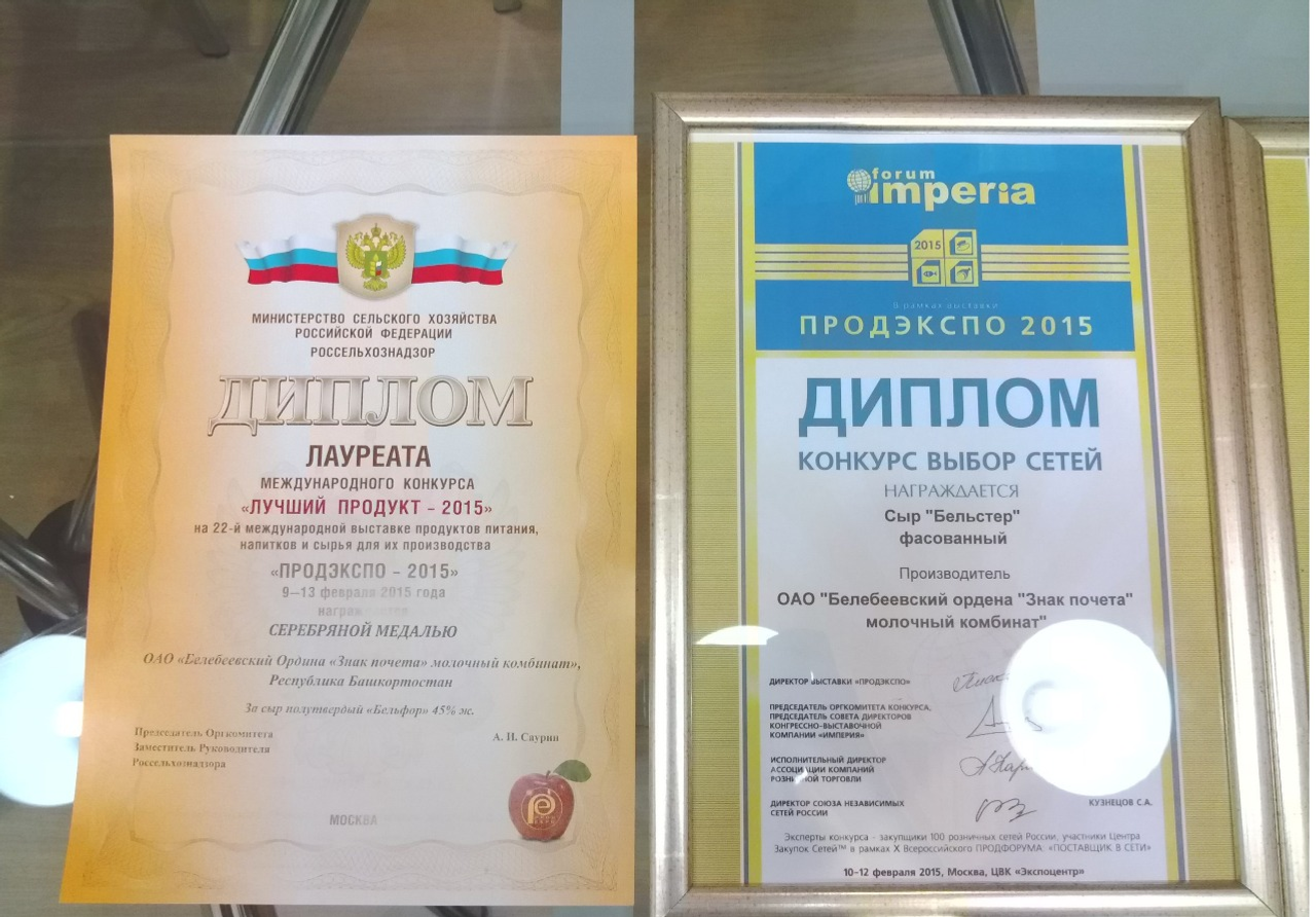 «Бельстер» «Инновациялы продукт» конкурсында еңеүсе булды һәм «Технологиялағы инновациялар» номинацияһында «алтын» яуланы. «Бельфор» «Иң яҡшы продукт-2015» халыҡ-ара конкурсында көмөш миҙалға лайыҡ булды. Бынан тыш, ошо сырҙар «Селтәрҙәр һайлауы» конкурсында дипломдар менән билдәләнде, тип хәбәр иттеләр республика Ауыл хужалығы министрлығының матбуғат хеҙмәтенән.