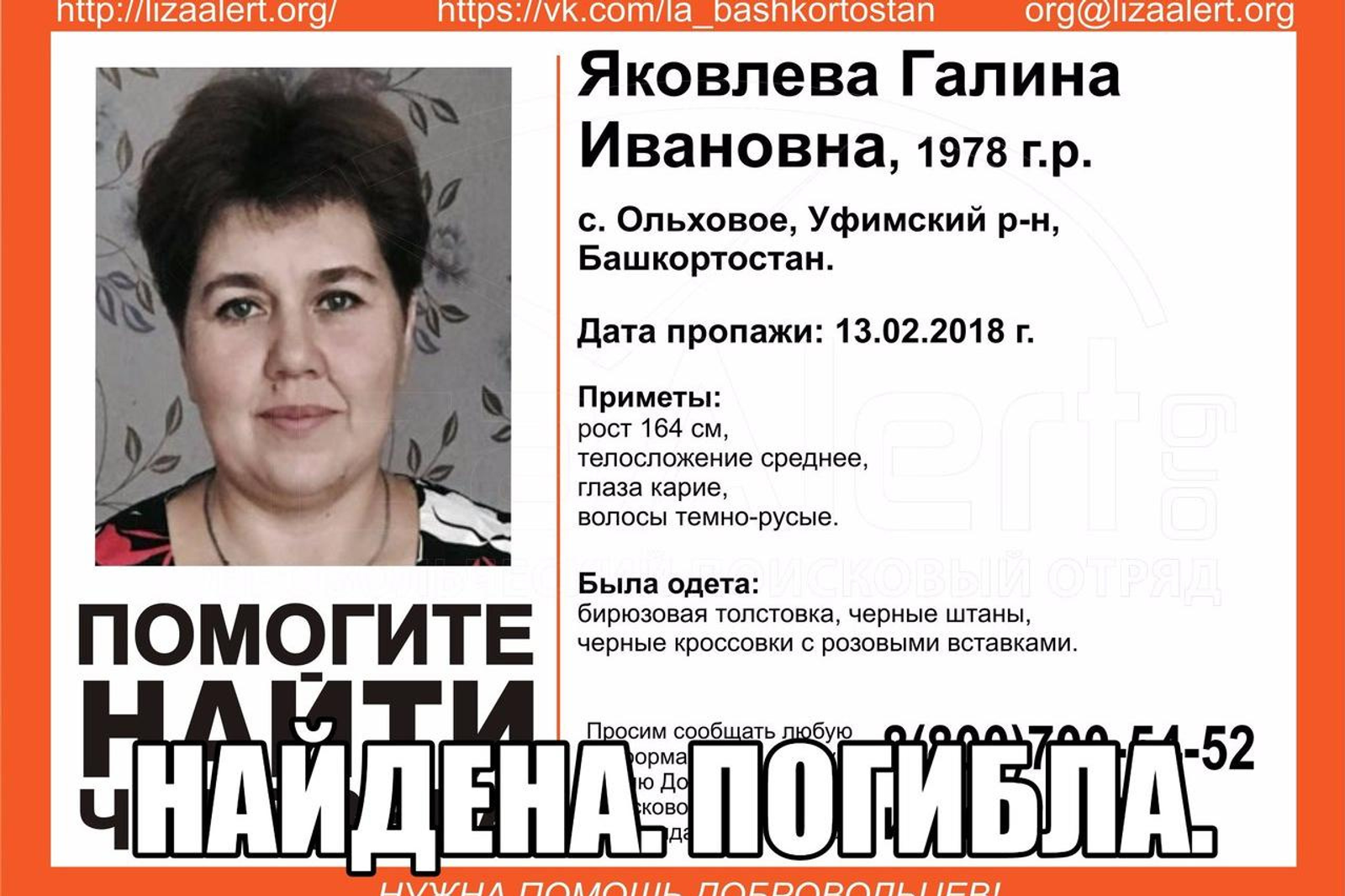 ӨФӨ, 2018 йыл, 20 февраль. /«Башинформ» мәғлүмәт агентлығы, Наталья Овчарук/. Полицейскийҙар һәм ирекмәндәр 39 йәшлек Галина Яковлеваны бер аҙна буйына эҙләне. 19 февраль көндө насар хәбәр килде: ҡатын үле килеш табылды. Был хаҡта «Лиза Алерт. Башҡортостан» төркөмө ирекмәндәре хәбәр итте.