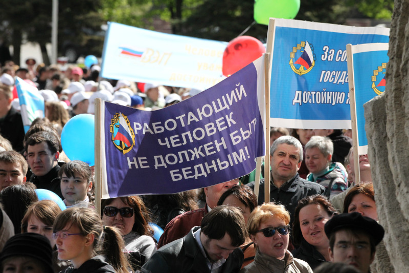Төшкө ун икелә майҙанда бер нисә меңләп кеше йыйылды. Хеҙмәтсәндәр митингыла иғлан иткән төп талаптар ғәҙел һәм, дөйөм алғанда, күптән традицияға ингән. Улар «Лайыҡлы эш хаҡы өсөн!», «Халыҡтың тулы мәшғүллеге өсөн!», «Хәүефһеҙ эш шарттары өсөн!», «Ышаныслы социаль гарантиялар өсөн!», «Йәштәрҙең һәм ветерандарҙың именлеге өсөн!» сығыш яһаны.