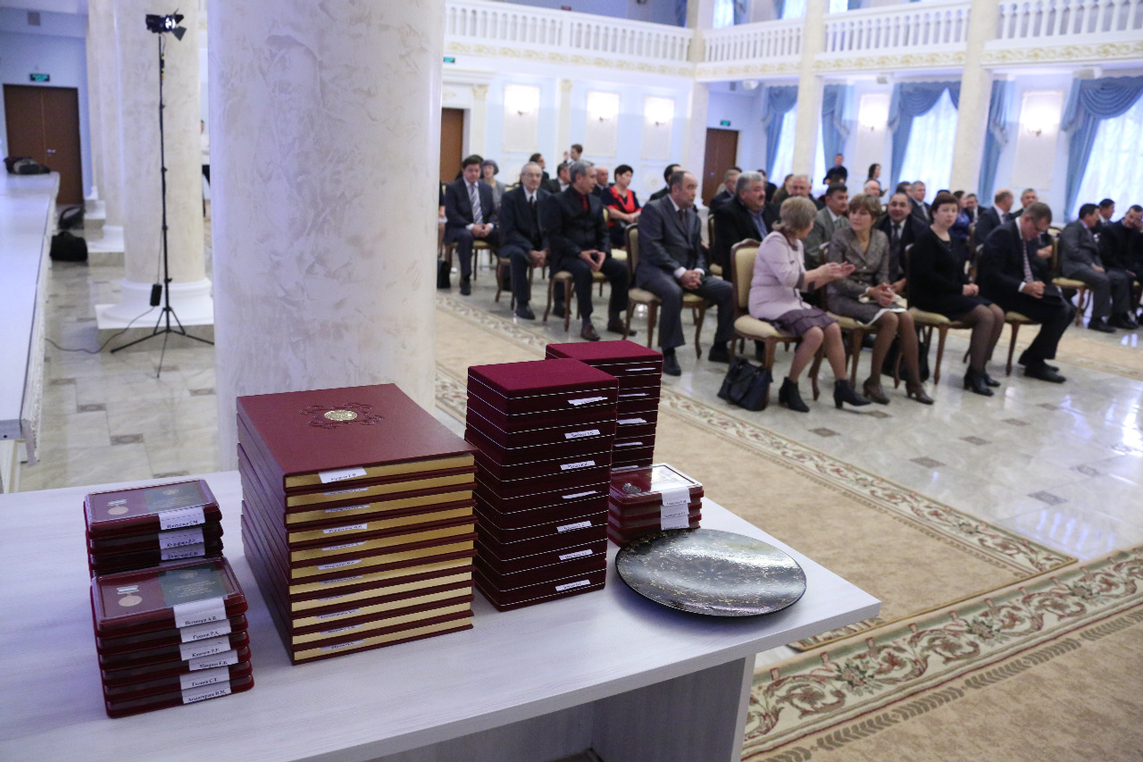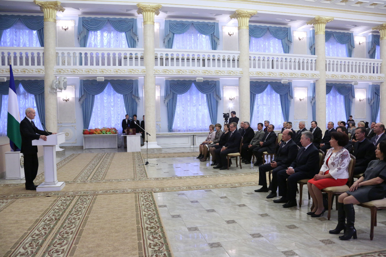 ӨФӨ, 2014 йыл, 29 октябрь. /«Башинформ» мәғлүмәт агентлығы, Илья Спиридонов/. 29 октябрҙә Өфөлә Башҡортостан Президенты Рөстәм Хәмитов Рәсәй Федерацияһының һәм Башҡортостан Республикаһының дәүләт наградаларын тапшырҙы. Республика башлығының матбуғат хеҙмәте хәбәр итеүенсә, 50 алдынғы сәнәғәт, ауыл хужалығы, төҙөлөш комплексы, социаль өлкә, һаулыҡ һаҡлау, фән һәм мәғариф, мәҙәниәт һәм сәнғәт хеҙмәткәре маҡтаулы исемдәр, почет грамоталары, рәхмәт хаттары, ордендар менән билдәләнде.