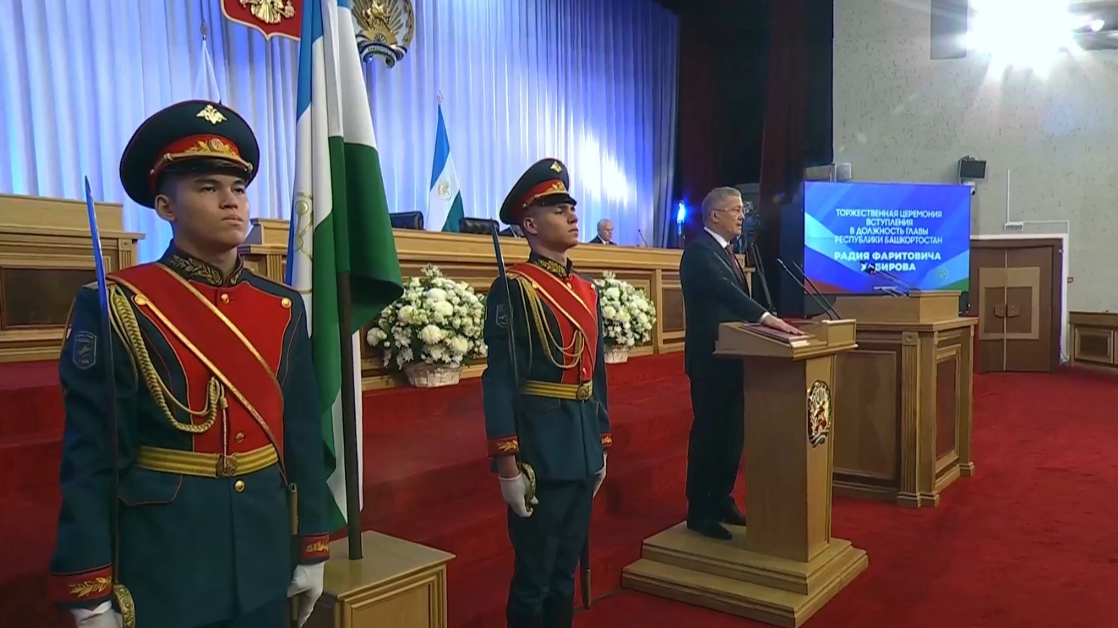 «Башҡортостан Республикаһы Башлығы вәкәләттәрен башҡарғанда Башҡортостан Республикаһының күп милләтле халҡына тоғро хеҙмәт итергә, Башҡортостан Республикаһы дәүләтселеген нығытырға һәм яҡларға, Рәсәй Федерацияһы Конституцияһын һәм Башҡортостан Республикаһы Конституцияһын үтәргә, кешенең һәм граждандың хоҡуҡтарын һәм иректәрен гарантияларға ант итәм», — тине Радий Хәбиров.