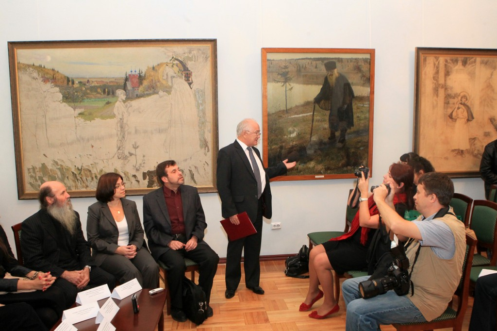 Күргәҙмәне асыу тантанаһы алдынан үткән матбуғат конференцияһында журналистарҙы юбилей сараларында ҡатнашыусылар менән таныштырҙылар. Улар – музей хеҙмәткәрҙәре, Нестеровтың ижадын өйрәнгән сәнғәт белгестәре, шул иҫәптән Рус музейы хеҙмәткәре, билдәле эксперт Павел Климов. Третьяков галереяһы директоры урынбаҫары Лидия Иовлева хәбәр итеүенсә, Мәскәүҙә Михаил Нестеровтың юбилей күргәҙмәһе 2013 йылдың яҙына планлаштырыла. «Бындай проекттарҙы тормошҡа ашырыу өсөн ваҡыт та, аҡса ла кәрәк. Өфө музейына республика етәкселеге тарафынан ярҙам күрһәтелде, шуға күрә бындай ҙур проект бойомға ашырылды ла инде. Беҙ Мәҙәниәт министрлығынан бер тин дә алманыҡ, күргәҙмәне хәйриә эшмәкәрлеге менән шөғөлләнгәндәр средстволары иҫәбенә ойошторабыҙ», — тип аңлатты Лидия Ивановна. Билдәле сәнғәт белгесе Нестеров көндәрендә ҡатнашҡан барлыҡ кешеләр исеменән рәссамдың ейәнсәренә – медицина фәндәре докторы Мария Ивановна Титоваға ярҙам күрһәткәне өсөн рәхмәтен белдерҙе. Журналистар һорауы буйынса ул үҙе хаҡында ла бер аҙ һөйләп ишеттерҙе.
