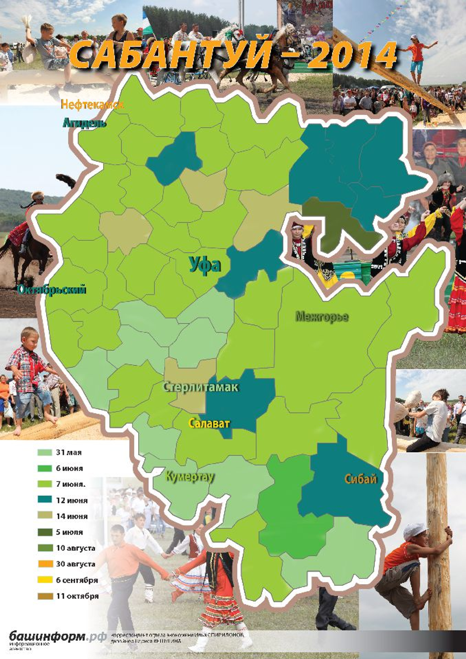 31 район – Әбйәлил, Архангель, Асҡын, Баҡалы, Балтас, Бәләбәй, Белорет, Бөрө, Благовар, Благовещен, Бүздәк, Бөрйән, Ғафури, Дүртөйлө, Йәрмәкәй, Ейәнсура, Илеш, Ҡалтасы, Ҡариҙел, Краснокама, Кушнарен, Мәләүез, Миәкә, Стәрлебаш, Тәтешле, Туймазы, Өфө, Учалы, Шишмә, Шаран, Яңауыл һәм Күмертау ҡалаһы «һабан байрамын» 7 июндә билдәләйәсәк.