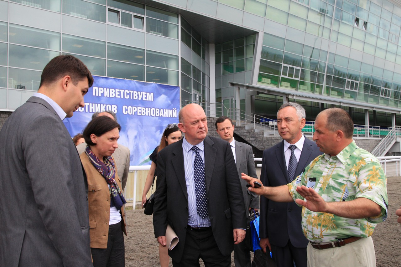 Европа иленең делегацияһы манежды, ат аҙбарын, ипподромдың бинаһын ҡараны. «Аҡбуҙат» директоры Руслан Ғиззәтуллин йүгерешеү юлы ҡапламының составы, дренаж системаһы тураһында ентекле һөйләне.