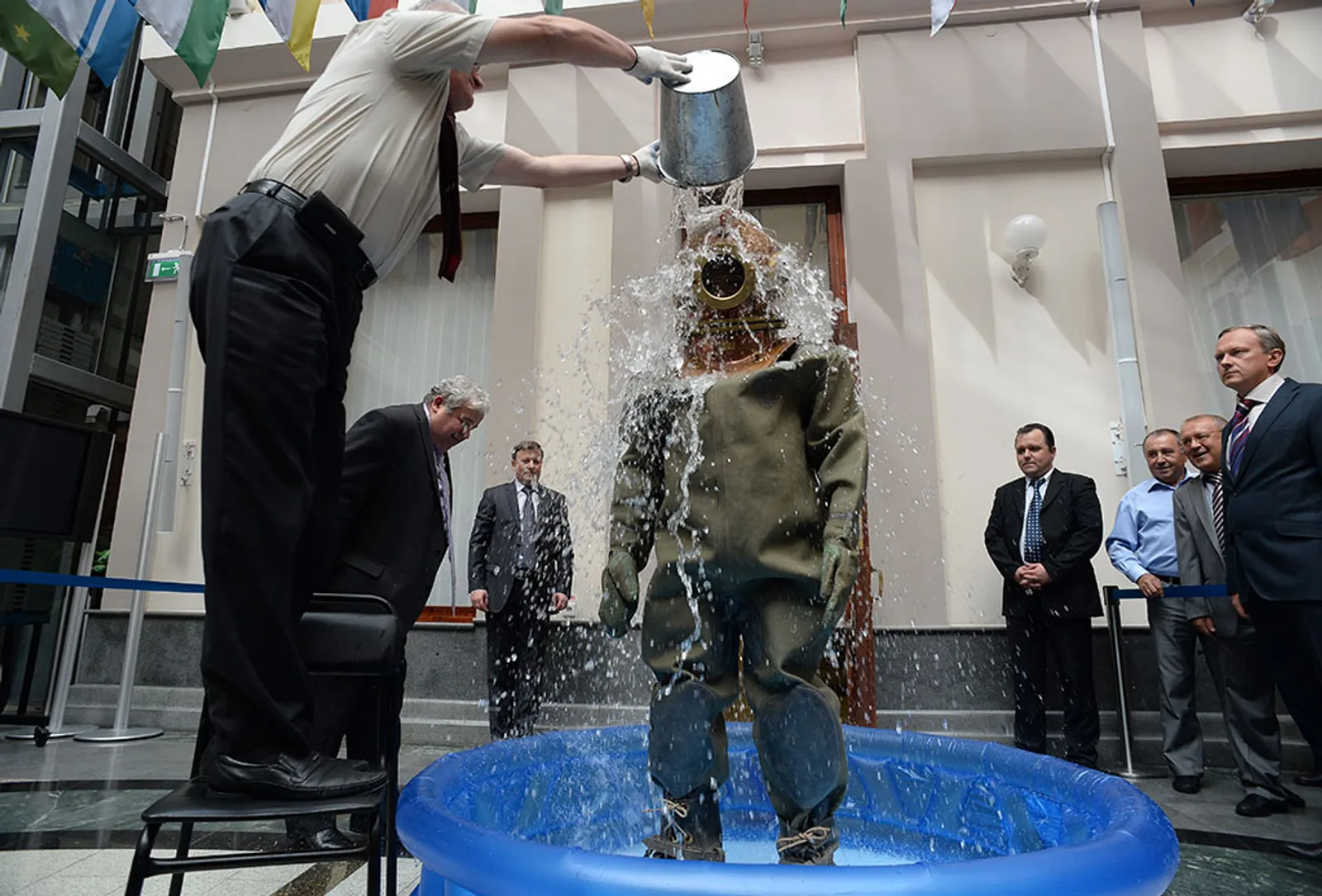 ӨФӨ, 2014 йыл, 9 сентябрь. /«Башинформ» мәғлүмәт агентлығы, Ғәлиә Нәбиева/. РФ Үҙәк һайлау комиссияһы башлығы Владимир Чуров, водолаздарҙың костюмын кейеп, үҙенә бер биҙрә һалҡын һыу ҡойҙо һәм был акцияны Башҡортостанда көслө дауылдан зыян күргәндәргә арнауын белдерҙе, тип хәбәр итә «Интерфакс».