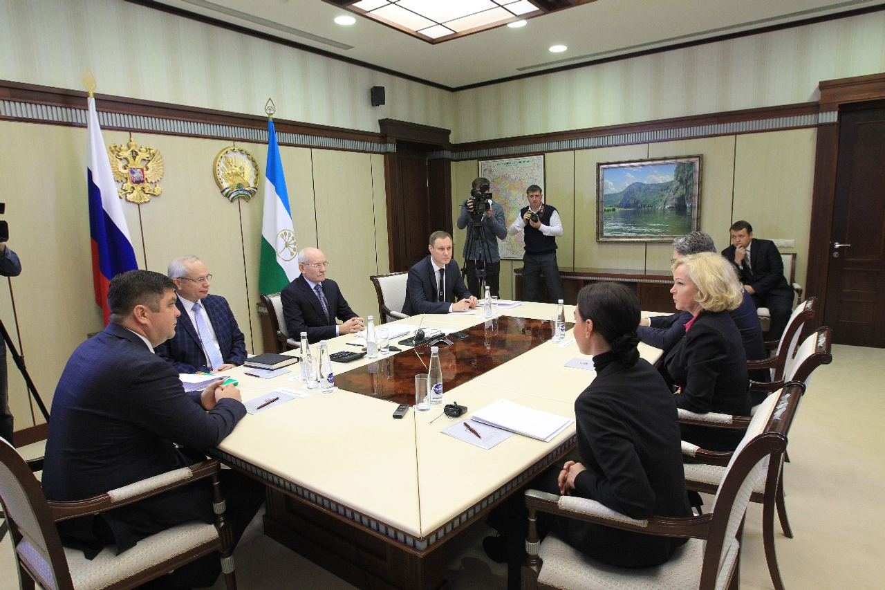 ӨФӨ, 2015 йыл, 19 октябрь. /«Башинформ» мәғлүмәт агентлығы, Александр Смирнов/. 19 октябрҙә Республика йортонда Башҡортостан Башлығы Рөстәм Хәмитов Внешэкономбанк Рәйесе урынбаҫары, Интеграция һәм иҡтисади үҫеш буйынса Хөкүмәт комиссияһы ҡарамағындағы моноҡалаларҙы яңыртыу буйынса эшсе төркөм етәксеһе Ирина Макиева һәм Моноҡалаларҙы үҫтереү фондының генераль директоры Илья Кривогов менән осрашты.