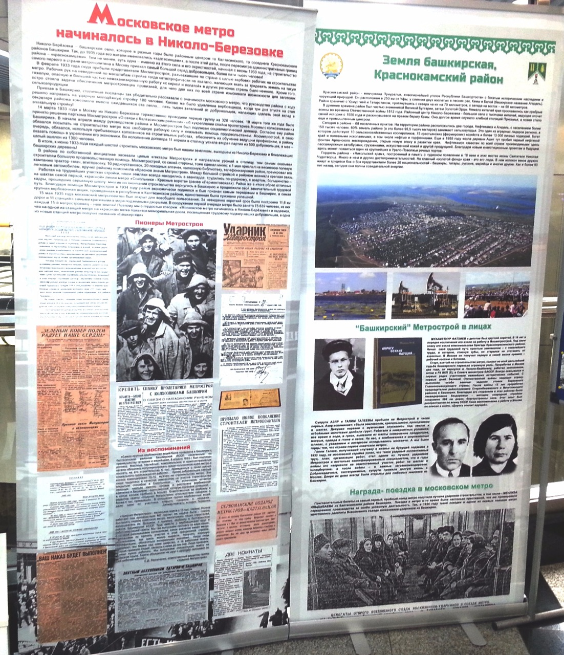 асылды. Ул ер аҫты төҙөлөшөнөң күп йыллыҡ тарихы, шул иҫәптән быға тиклем аҙ билдәле булған тарихи факттар менән таныштыра. Башҡортостан экспозицияһынан мәскәүҙәр метрополитендың тәүге сиратын төҙөү өсөн республиканың тәүҙә Ҡалтасы, хәҙер иһә Краснокама районы үҙәге Николо-Берёзовка ауылынан биш меңгә яҡын кешенең килеүе хаҡында белде.