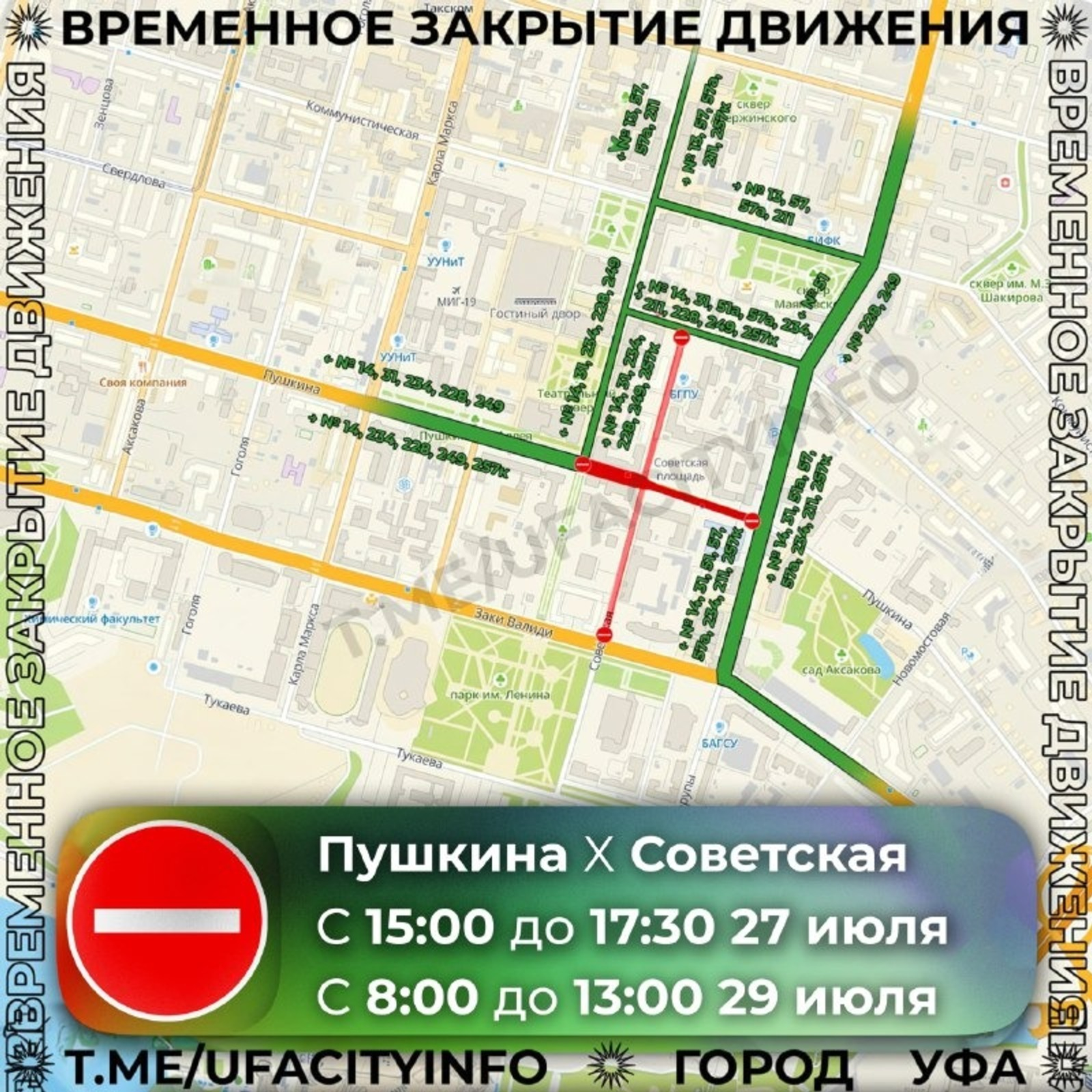 Өфөнөң Совет майҙаны янында автомобиль һәм йәмәғәт транспорты хәрәкәтен ябыу ваҡыты үҙгәрҙе, унда 27 июлдә Рәсәй эске эштәр органдары белгестәрен сығарылыш тантанаһы була.
