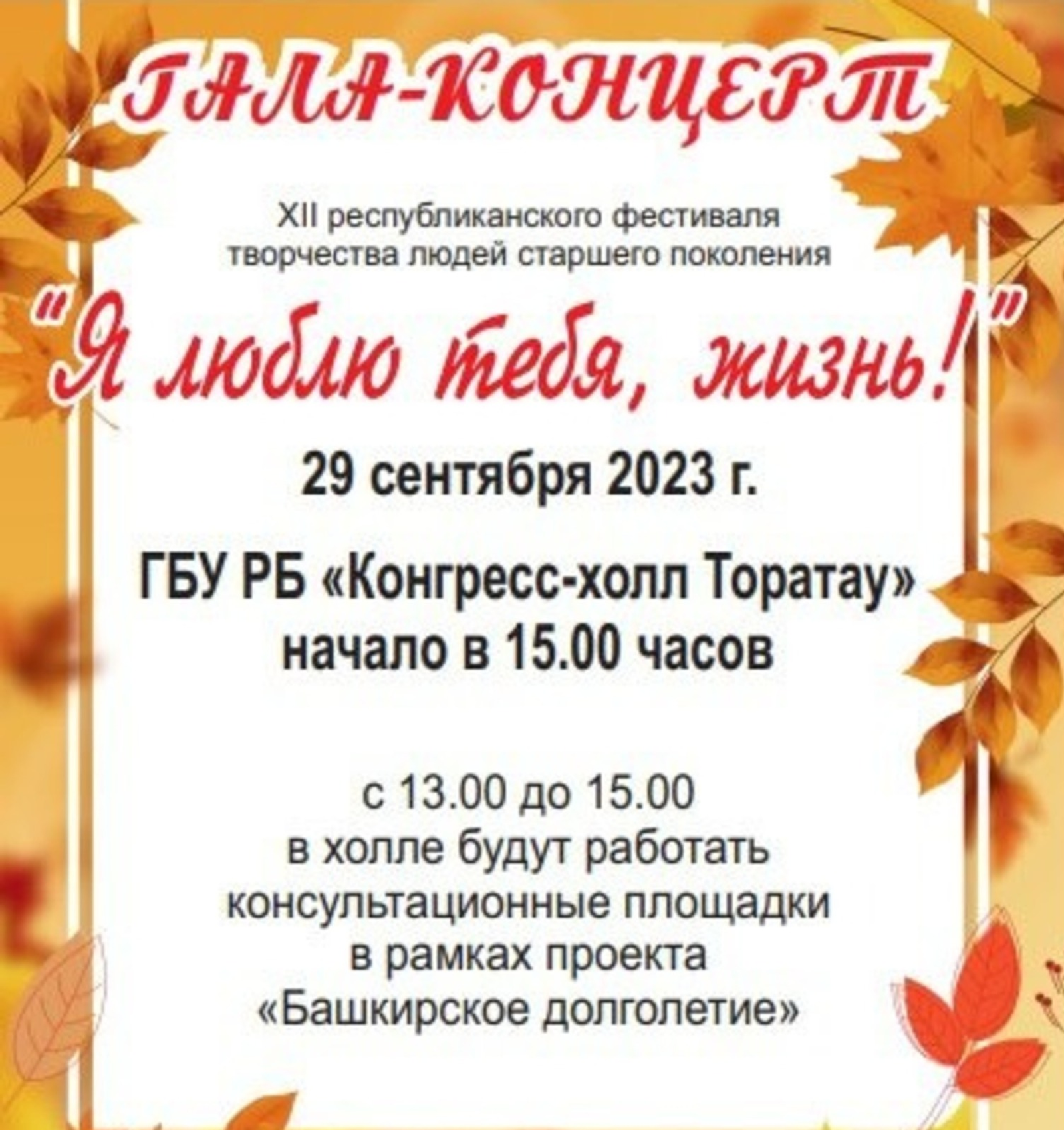 29 сентябрҙә Өфө конгресс-холында оло йәштәгеләрҙең «Мин яратам һине, тормош!» республика фестиваленең гала-концерты була. Йыл һайын сағыу фестивалдә тотош республиканан 55 йәштән өлкәнерәк 2500-ҙән ашыу үҙешмәкәр артист ҡатнаша.