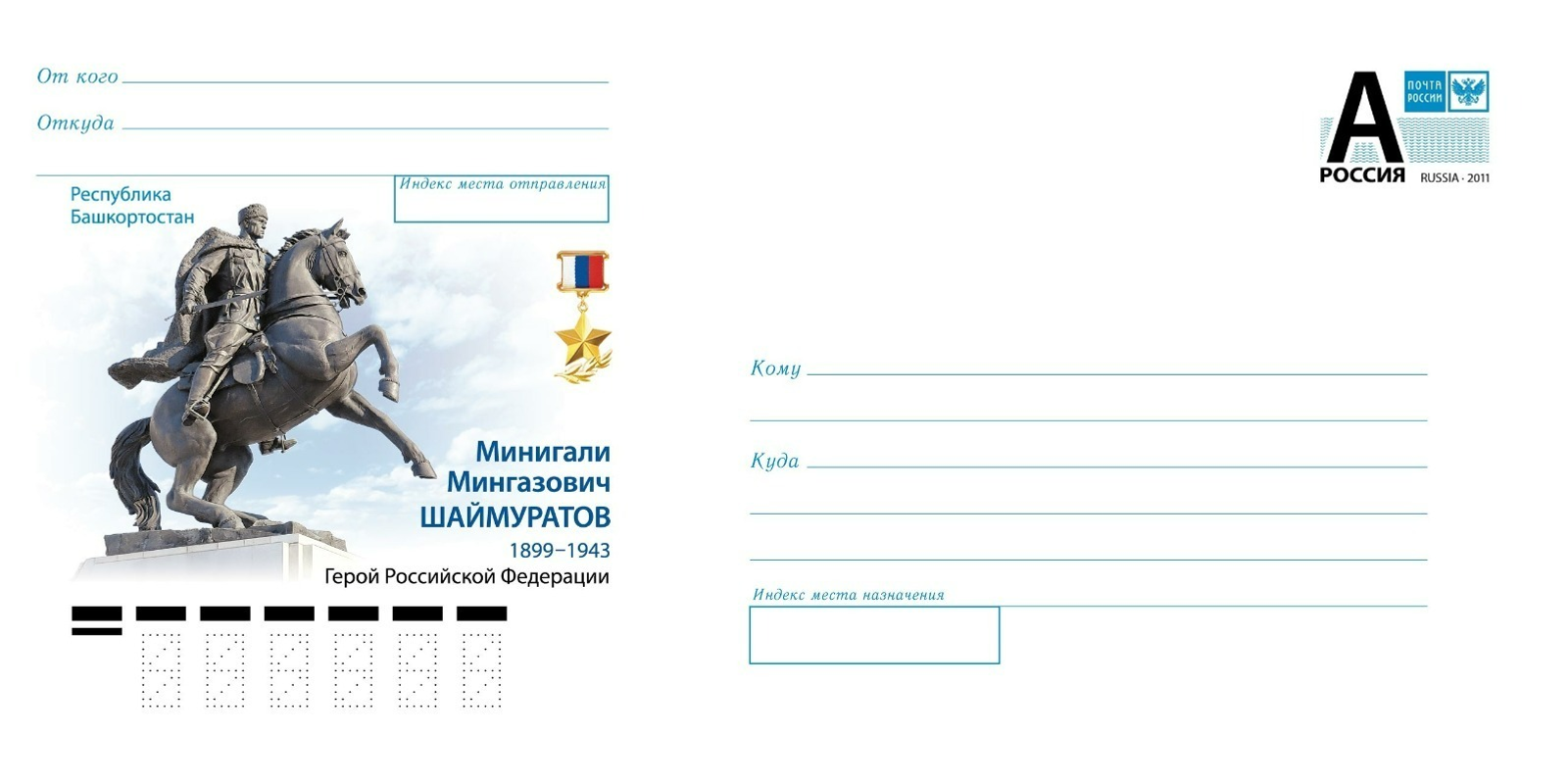 Рәсәй Геройы, генерал-майор Миңлеғәле Шайморатовтың Өфөләге һәйкәле төшөрөлгән конверт почта әйләнешкә сығарылды. Тантаналы сара Өфө почта бүлексәһендә үтте.