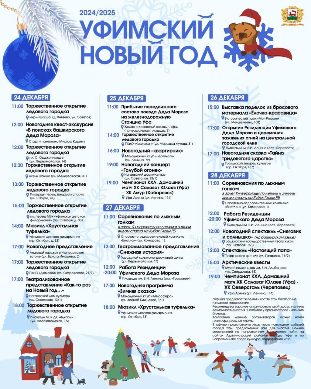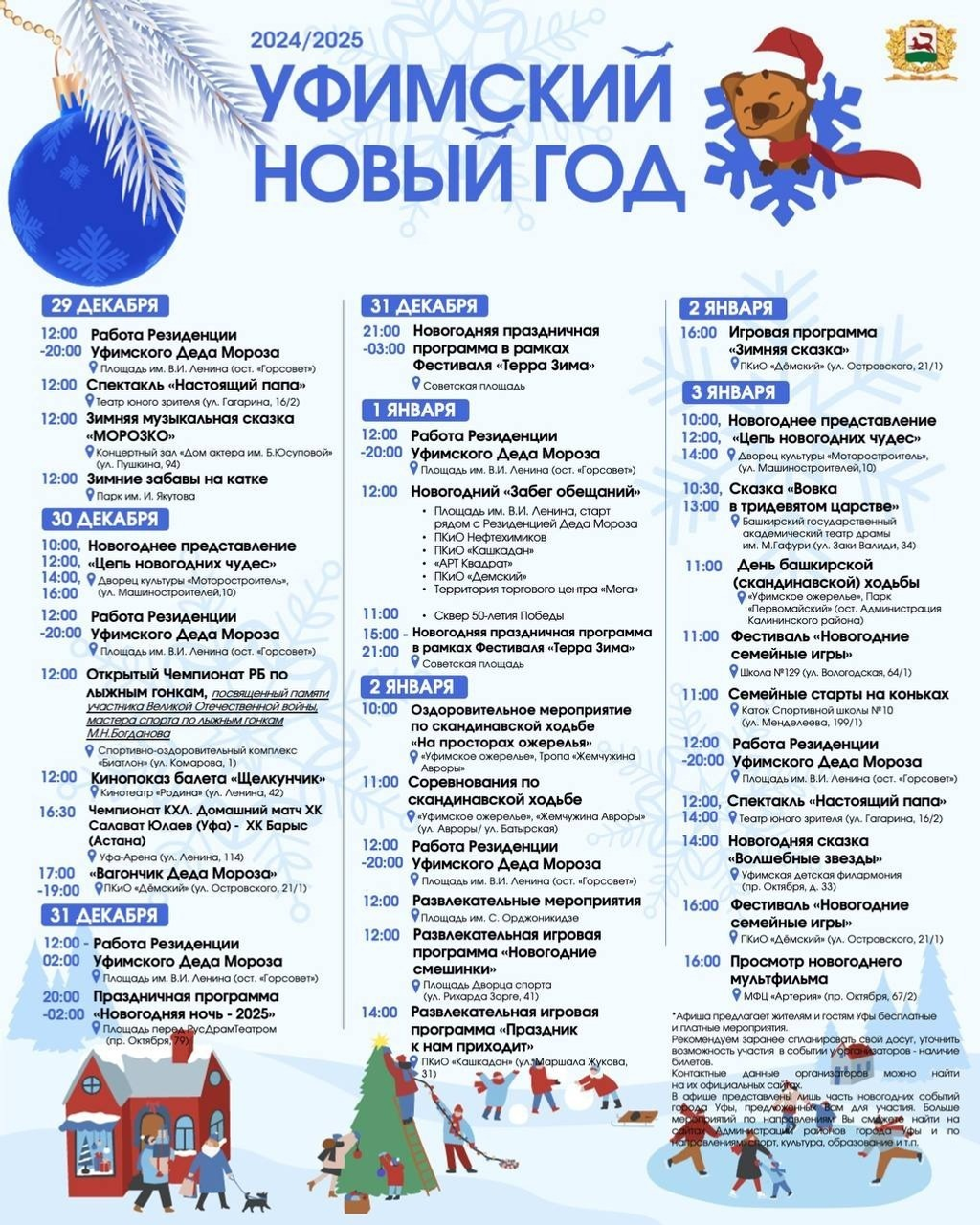 Өфөлә яңы йыл сараларының программаһы билдәле булды. Ҡала мэры Ратмир Мәүлиев 15 декабрҙә социаль селтәрҙәге сәхифәһендә яҙыуынса, улар араһында квестар, тамашалар, спектаклдәр, оҫталыҡ дәрестәре, ярыштар һәм чемпионаттар бар.
