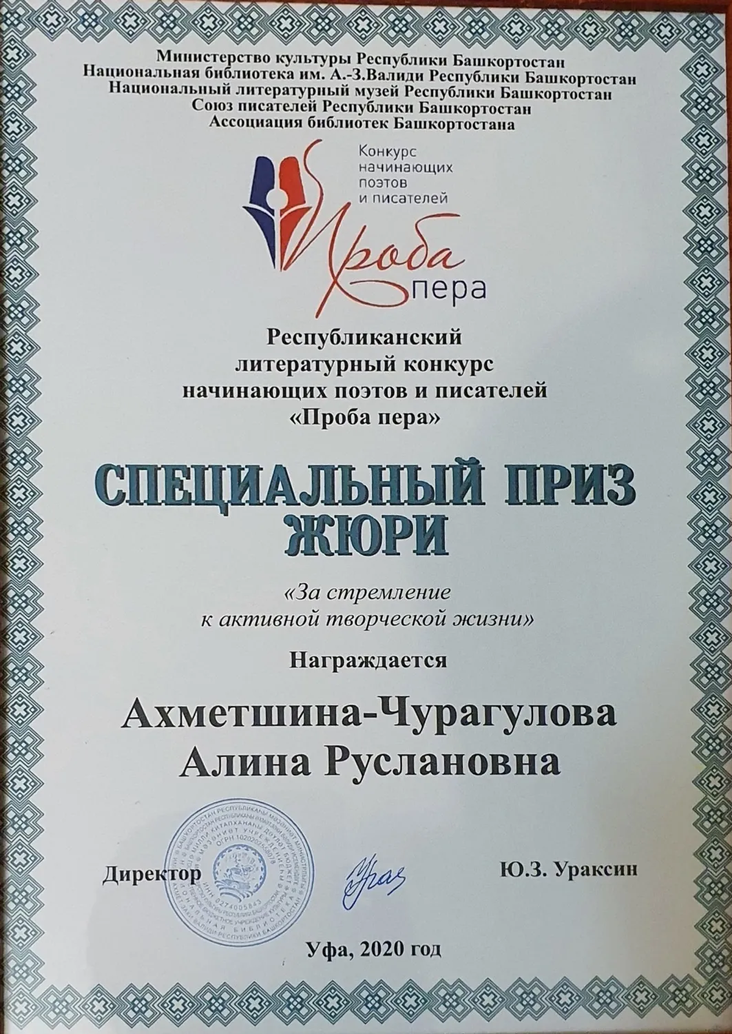 «Спорт мине сыныҡтырҙы. Үҙемде һәр ерҙә лә ышаныслы тоторға өйрәтте. Быға уҡыуымдағы, шиғриәттәге уңыштарымды ла бәйләп әйтә алам», – ти Алина. Шиғриәт, тигәндәй, 2019 йылда ул БР Яҙыусылар союзы үткәргән «Башҡортостан әҙәбиәт мәктәбе» конкурсында еңеү яулай, шиғырҙары йәш ижадсылар йыйынтығында баҫылып сыға. Ошо ҡыуанысы менән уртаҡлашыр өсөн үҙе тыуып үҫкән Саҡмағош районының Яңы Балтас ауылында «Донъям яҡты» тип исемләнгән ижад кисәһе үткәрә. Килгән ҡунаҡтар Алинаның ижадҡа, кешелеккә, донъяға һөйөүенең көслө булыуына һоҡланып, тамашаны күҙ йәштәрен тыя алмай ҡарай.