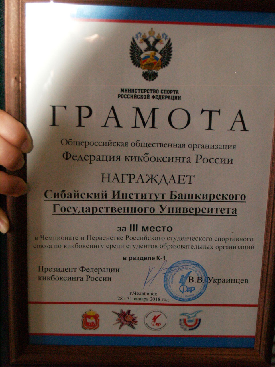 Кикбоксинг буйынса Рәсәй студенттары спорт союзы чемпионатында һәм беренселегендә дөйөм зачетта Башҡорт дәүләт университетының Сибай институты өсөнсө урын алды һәм Рәсәй Федерацияһы Спорт министрлығының Почет грамотаһы һәм Кубогы менән бүләкләнде. Еңеүселәргә наградаларҙы Рәсәй Кикбоксинг федерацияһы президенты Вадим Украинцев тапшырҙы, тип хәбәр иттеләр юғары уҡыу йортоноң матбуғат хеҙмәтенән.