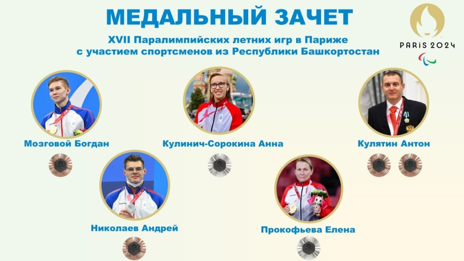 Республиканың Адаптив спорт төрҙәре үҙәге хәбәр итеүенсә, еңел атлет Анна Кулинич-Сорокина, Елена Прокофьева (өҫтәл теннисы) көмөш миҙалдар яуланы. Богдан Мозговой, Андрей Николаев (йөҙөү) һәм Антон Кулятин (еңел атлетика) бронза наградалар алды.