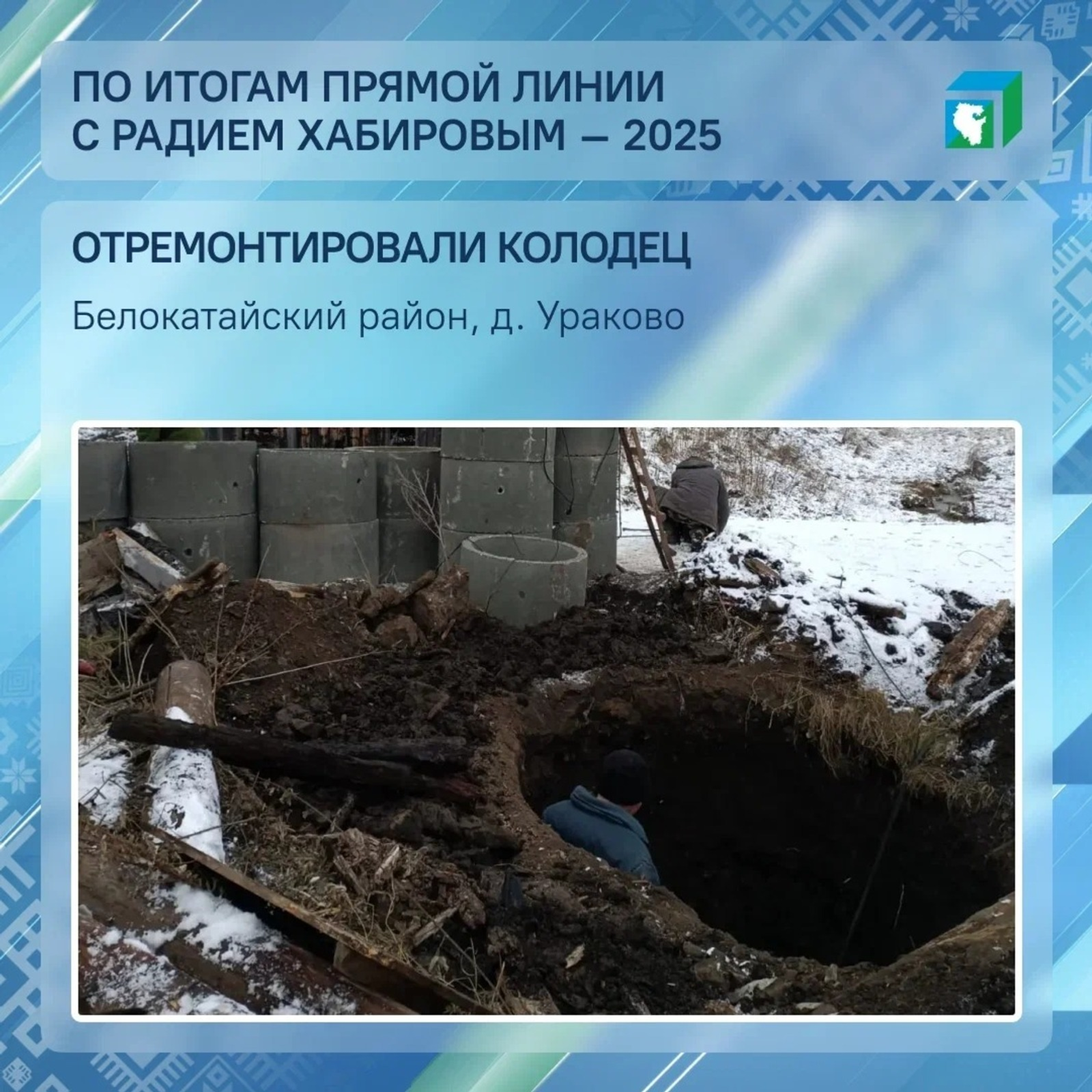 Район хакимиәте был мәсьәләне контролгә алды һәм халыҡ өсөн мөһим объектты төҙөкләндереүгә аҡса бүлде. Белгестәр ауыл ҡоҙоғон ноябрь аҙағында ремонтлай башланы. 12 декабргә ул әҙер ине.